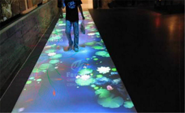 地面互動投影系統(tǒng)采用懸掛在頂部的投影設(shè)備把影像效果投射到地面,當(dāng)人走至投影區(qū)域時,通過系統(tǒng)識別,他們可以直接使用雙腳或動作與投影幕上的虛擬場景進(jìn)行交互,各種互動效果就會隨著人的腳步產(chǎn)生相應(yīng)的變幻。